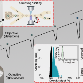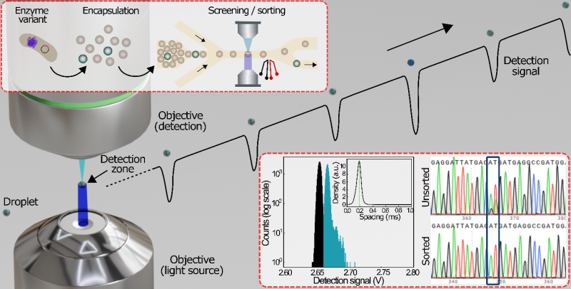 Une équipe du Centre de recherche Paul Pascal (CNRS/Université de Bordeaux) propose donc un système innovant de criblage par absorption « activée » des gouttelettes (cAADS) combinant détection confocale et tri actif. Cette méthode de détection qui met en jeu un diaphragme pour filtrer la lumière à l’entrée du détecteur permet d’améliorer la résolution spatiale (images plus nettes et contrastées). Les scientifiques ont ainsi pu réaliser des mesures d'absorbance d’une sensibilité inédite à un débit ultra-élevé de 5,4 kHz, soit une vitesse 3,6 fois supérieure aux meilleures approches de criblage par absorbance existantes, avec des gouttelettes d’une taille de l’ordre de 10 pL. Cette méthode leur a ainsi permis de sélectionner les variants actifs de la bilirubine oxydase2 avec une efficacité de 99 % et de réaliser le criblage de la glucose oxydase qui catalyse l’oxydation du glucose, démontrant ainsi la polyvalence du système.